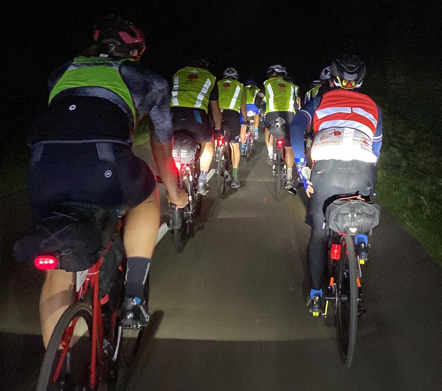 A los 5 min ya estoy en marcha otra vez, el control esta en el km 200 osea unos 85 km me quedan para llegar.Tengo suerte y me uno a un buen grupo, unos 15 ciclistas y lo bueno es que mas de la mitad son de un mismo club y van relevando sin hacerse los remolones. Para mi sorpresa coincido con Lui, mi vecino de furgoneta en Ramboulliet y participante en el concurso de bicis artesanas. Alguien conocido con el que poder compartir algunas palabras durante la noche. El ritmo es constante, sin apretones pero alegre, ya que no te puedes despistar porque si no estas atento al adelantar a otros ciclistas, tienes que hacer esfuerzo para no perder la buena rueda.